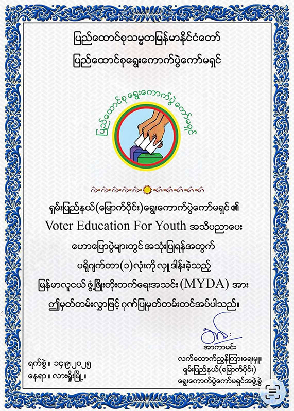မြန်မာလူငယ်ဖွံ့ဖြိုးတိုးတက်ရေးအသင်း (MYDA) သည် မြန်မာလူငယ်များ ရွေးကောက်ပွဲ ဆိုင်ရာ ဗဟုသုတများ တိုးပွားရရှိစေရန်အတွက် ပြည်ထောင်စုသမ္မတ မြန်မာနိုင်ငံ၊ ပြည်ထောင်စု ရွေးကောက်ပွဲ ကော်မရှင်မှ တာဝန်ရှိသူများနှင့် တွေ့ဆုံကာ ရွေးကောက်ပွဲဆိုင်ရာ အသိပညာပေးအစီအစဉ်များအား လူငယ်ထုအတွင်းပိုမိုသိရှိနိုင်စေရန် အတူတစ်ကွ ပူးပေါင်းဆောင်ရွက်လျက်ရှိပါသည်။