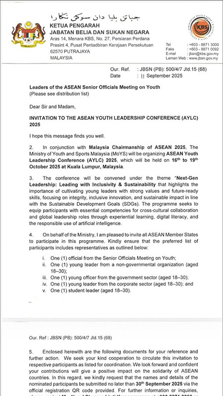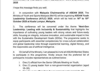 “ASEAN Youth Leadership Conference (AYLC)2025” သို့တက်ရောက်ရန် မြန်မာလူငယ်ဖွံ့ဖြိုးတိုးတက်ရေးအသင်းမှ ထူးချွန်လူငယ်နှစ်ဦးအား စေလွှတ်ခြင်း
