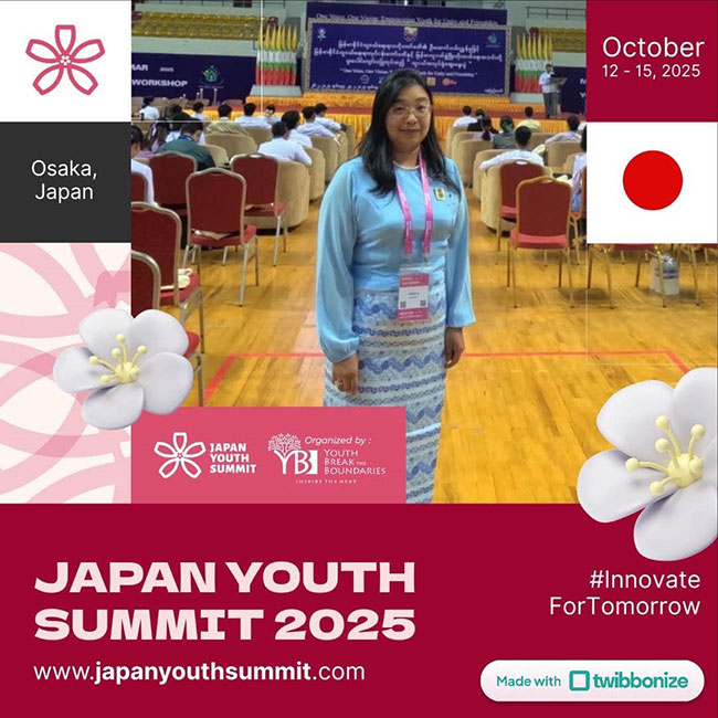 Youth Break the Boundaries (YBB) Foundation မှကြီးမှုး၍ ၂၀၂၅ ခုနှစ် အောက်တိုဘာလ (၁၁) ရက်နေ့မှ (၁၅) ရက်နေ့အထိ ဂျပန်နိုင်ငံ၊ အိုဆာကာမြို့တွင် ကျင်းပမည့် Japan Youth Summit 2025 သို့ တက်ရောက်ရန် ရွေးချယ်ခံရသည့် မြန်မာလူငယ်ဖွံ့ဖြိုးတိုးတက်ရေး အသင်း၏ ဘဏ္ဍာရေးမှုး ဒေါ်ကြည်စင်ရွှေ အတွက်များစွာ ဂုဏ်ယူဝမ်းမြောက်မိပါကြောင်း မှတ်တမ်းတင်ဂုဏ်ပြုအပ်ပါသည်။