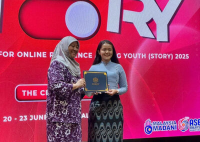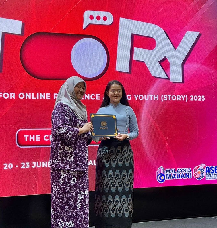 မြန်မာလူငယ်ဖွံ့ဖြိုးတိုးတက်ရေးအသင်း၏ ထူးချွန်လူငယ် တစ်ဦးဖြစ်သည့် ပြင်ဦးလွင်မြို့မှ မမိုးသဉ္ဇာခိုင် သည် မလေးရှားနိုင်ငံ၊ ကွာလာလမ်ပူမြို့တွင် ၂၀၂၅ ခုနှစ်၊ ဇွန်လ ၂၀ရက်နေ့မှ၂၃ ရက်နေ့ အထိကျင်းပသည့် “SHARING TOGETHER FOR ONLINE RESILIENCE AMONG YOUTH (STORY) 2025 – THE CHANGEMAKERS” သို့ ပါဝင်တက်ရောက်ခဲ့ပါသည်။
